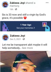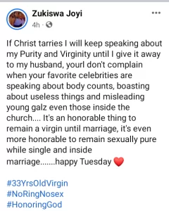 “You all don’t complain when your favorite celebrities are speaking about body counts, boasting about useless things and misleading young galz even those inside the church…. It’s an honorable thing to remain a virgin until marriage, it’s even more honorable to remain sexually pure while single and inside marriage…….happy Tuesday. #33YrsOldVirgin #NoRingNosex #HonoringGod”