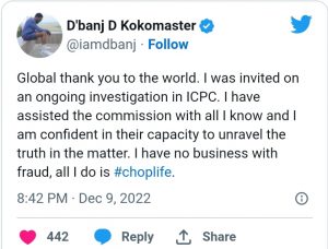 “Global thank you to the world. I was invited on an ongoing investigation in ICPC. I have assisted the commission with all I know and I am confident in their capacity to unravel the truth in the matter. I have no business with fraud, all I do is #choplife,” he wrote.