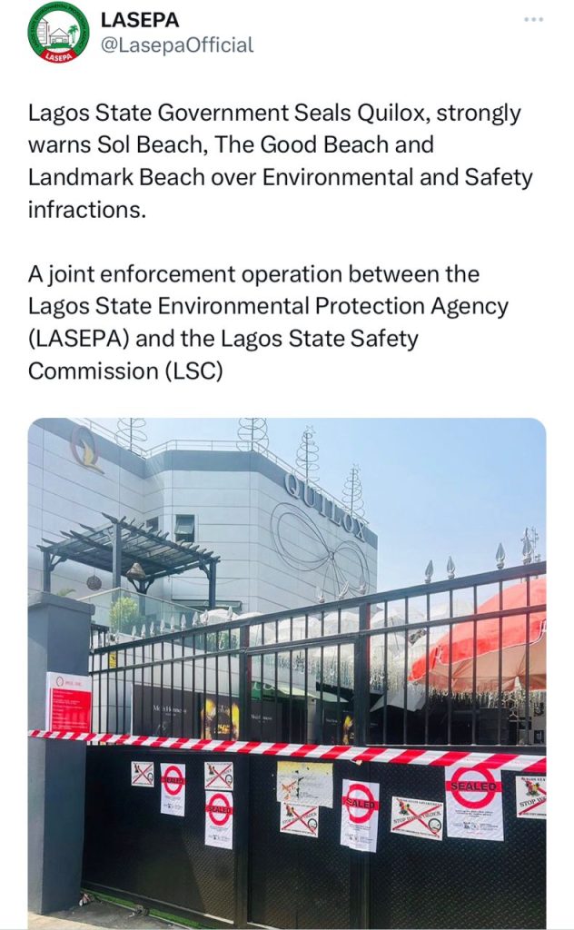 “A joint enforcement operation between the Lagos State Environmental Protection Agency and the Lagos State Safety Commission sealed Quilox nightclub over environmental and safety infractions,” LASEPA announced via its X handle.